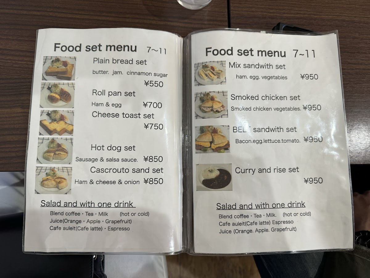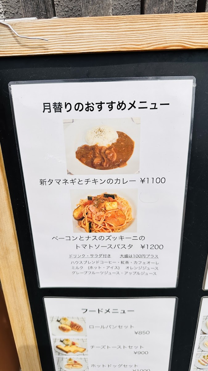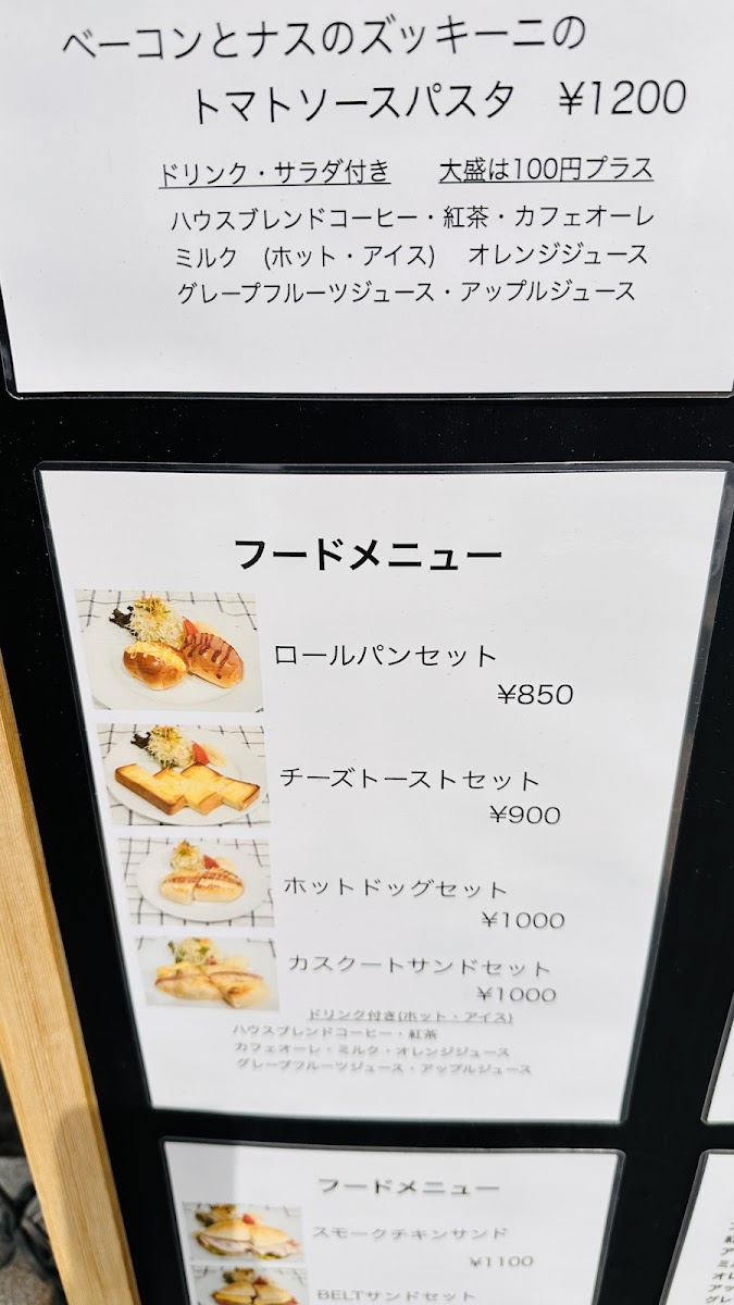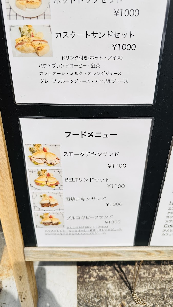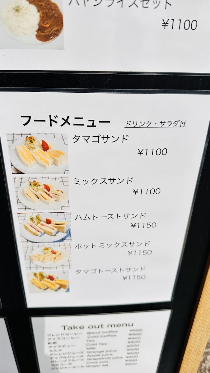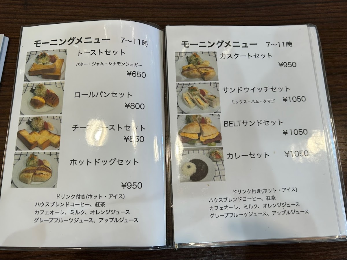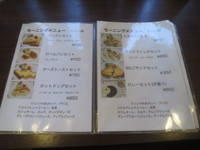 Food selections feature sandwiches such as カスクートサンドモーニング (casse-croute morning sandwich), belt sandwiches, BLTE, and light meal choices like curry rice and 豚肉とカボチャのカレー (pork and pumpkin curry). Toast options are also available, providing simple breakfast or snack items.